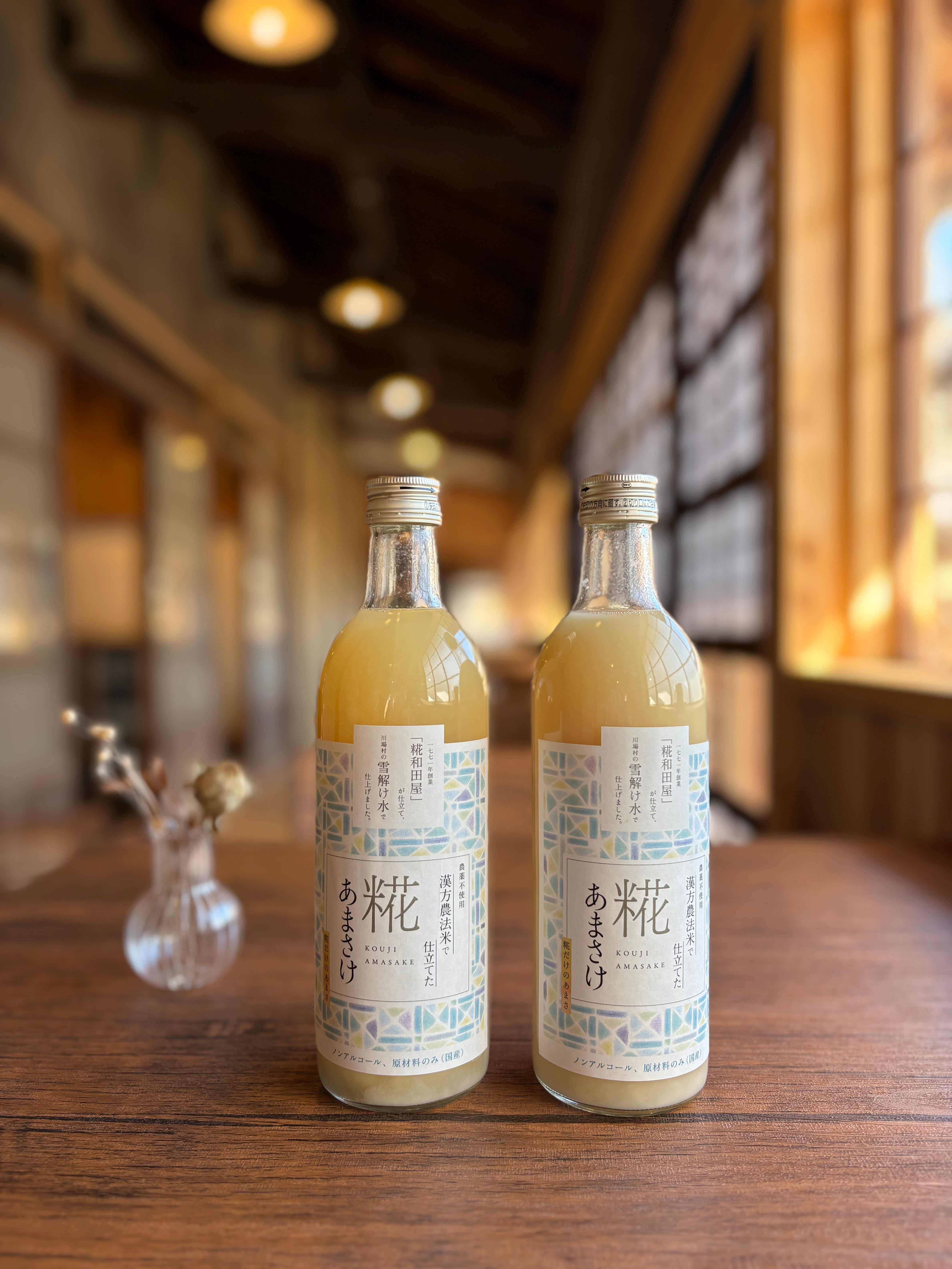 誠農社の漢方農法米を福島の老舗「糀和田屋」さんに糀として仕立てて頂き、川場村にある「(有)かわば」さんに川場村の雪解け水であまさけに仕上げて頂きました。